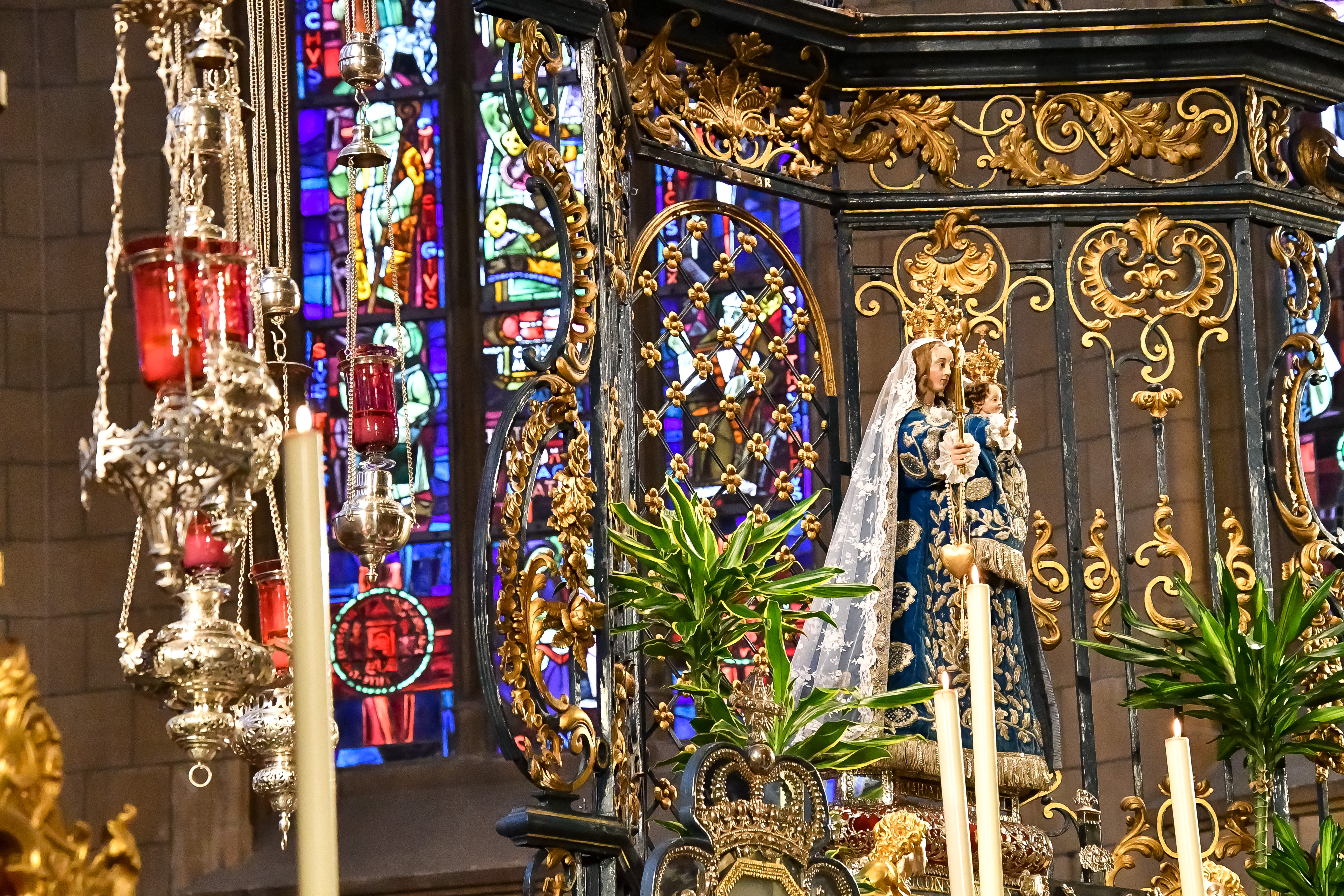 Home / Consolatrix / Ensemble en velours bleu pétrole, rinceaux de chênes et étoiles en broderie appliquée en fil d'argent /